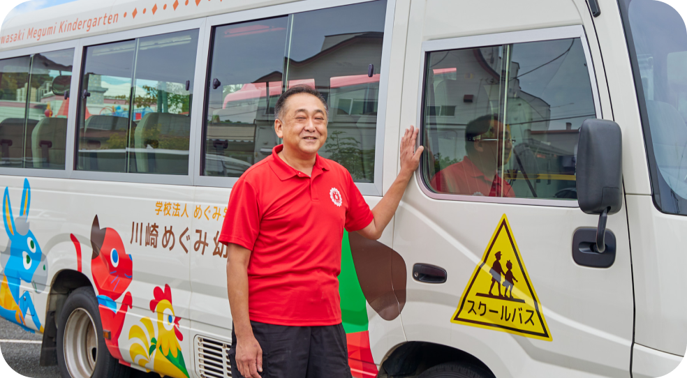 毎⽇、園児たちを送り迎えするために使っています。今は⼤体100⼈ぐらいが利⽤していて、1コース40分ぐらいを目安に回っている状態ですね。幼稚園を中⼼にいろいろな⽅向へ回っているので今は5台のバスを6コースで組んでいます。そして、送迎だけではなく秋の遠⾜、春の遠⾜があるのですが、これもこのバスを使っています。